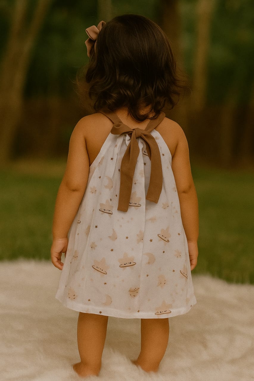 Delicately crafted from soft, breathable muslin frock, this charming frock is the prefect blend of comfort and elegance. The standout feature is the adorable back tie with a standard knot bow, adding a sweet, feminine touch. Ideal for warm weather outings, birthdays or casual occasions, this frock offers both ease and timeless appeal. Available in a variety of shades and designs.