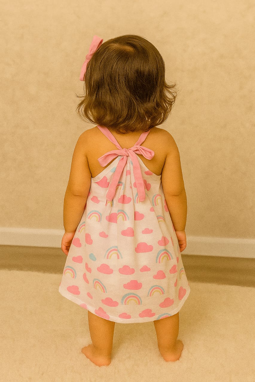 Delicately crafted from soft, breathable muslin frock, this charming frock is the prefect blend of comfort and elegance. The standout feature is the adorable back tie with a standard knot bow, adding a sweet, feminine touch. Ideal for warm weather outings, birthdays or casual occasions, this frock offers both ease and timeless appeal. Available in a variety of shades and designs.