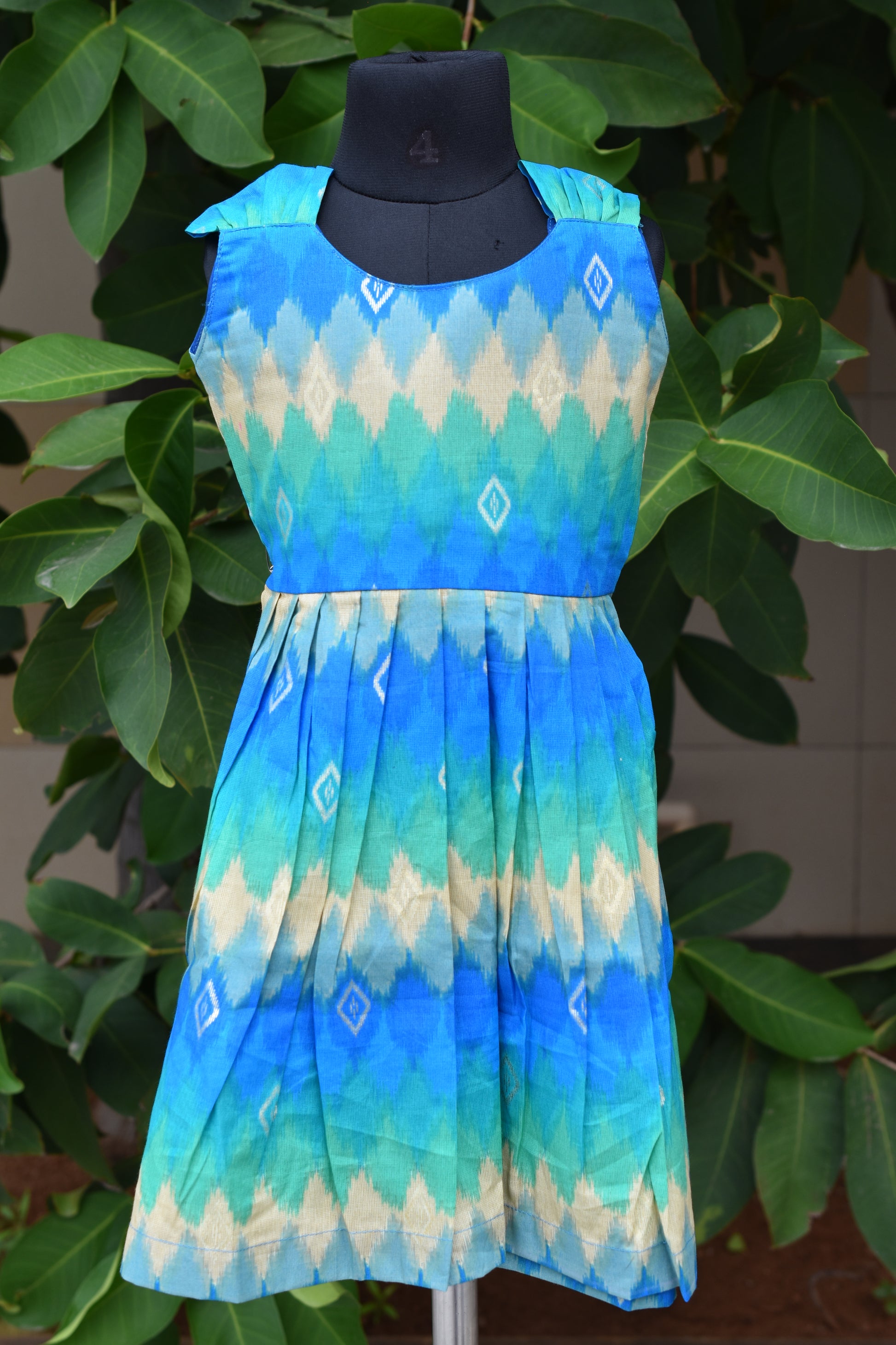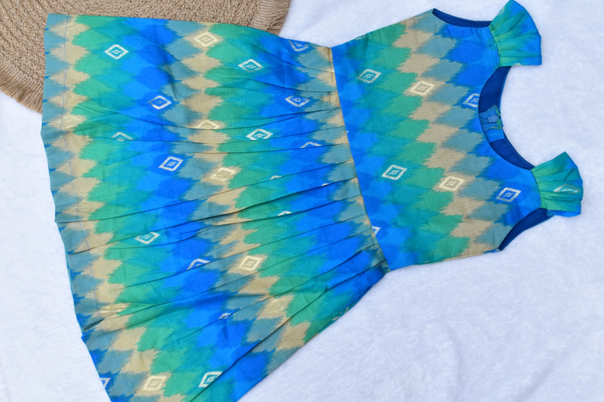 Introduce a pop of color and artisanal charm to any wardrobe with this exquisite pleated frock. Watch her twirl in this playful and eye-catching dress. The bright Ocean Blues and Moss Greens of the chevron-diamond pattern create a striking visual effect. The standout feature is the structured, tailored pleating on the front, giving the skirt a beautiful, flowing cascade. Paired with sweet, ruched shoulder detailing, this frock is as comfortable as it is photogenic. Perfect for outings and special occasions.